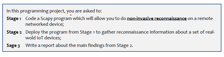 For this project, Scapy library in python was used to create an ipv4 scanner that recorded non-invasive reconnaissance data on remote networked devices. Such as whether the device was responsive, IP-ID counter deployed (TCP), port 80 opened, SYN cookie deployed, IP-ID counter(ICMP), and OS deployed. This was tested on real-time IoT devices and creates an CSV file of the recorded data.